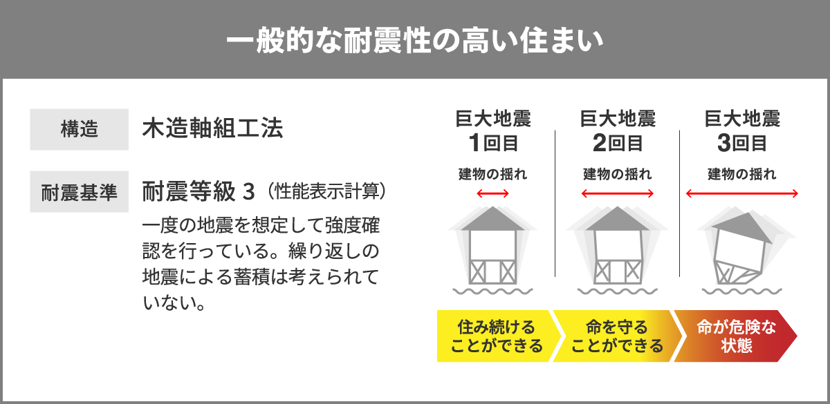 地震の揺れによる建物の変形エネルギーを吸収・分散することで、 構造部材にかかる負担を軽減し、繰り返す巨大地震にも強い家を実現しました。