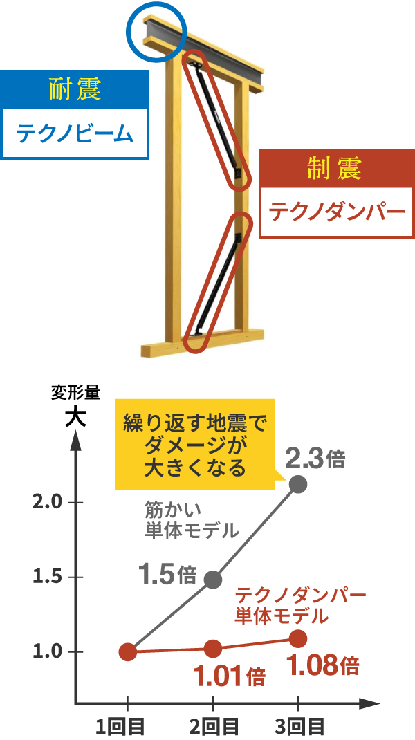 テクノストラクチャーEXでは、テクノビームの耐震性に加え、「制震システム・テクノダンパー」を導入。
