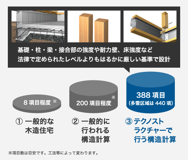 しかし、テクノストラクチャーEXでは「壁量計算」だけでは不十分と考え、「基礎・柱・梁・接合部・床強度・耐力壁」など構造的に負担のかかる全ての部分が、荷重や地震に対して十分に耐えられるかどうかを緻密に計算する「許容応力度計算」を一棟一棟全ての住宅で行っています。