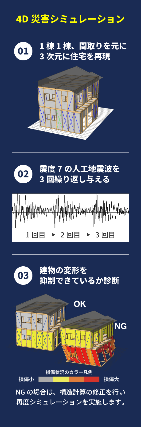 建物を3Dモデル化し、震度7クラスの人工地震波を3回連続で入力。 1回きりの大地震ではなく、“繰り返しの巨大地震”に対して、 どの程度の変形・損傷が発生するかを、1棟ごとに検証しています。