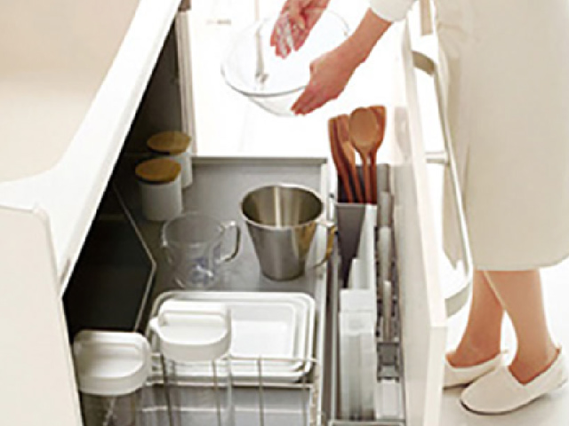 たっぷり収納できる引き出しは安心のブルモーション。奥行きのある引き出しには大きなお鍋やフライパンなどがスッキリと収まります。チャイルドロック付きで安全にも考慮。