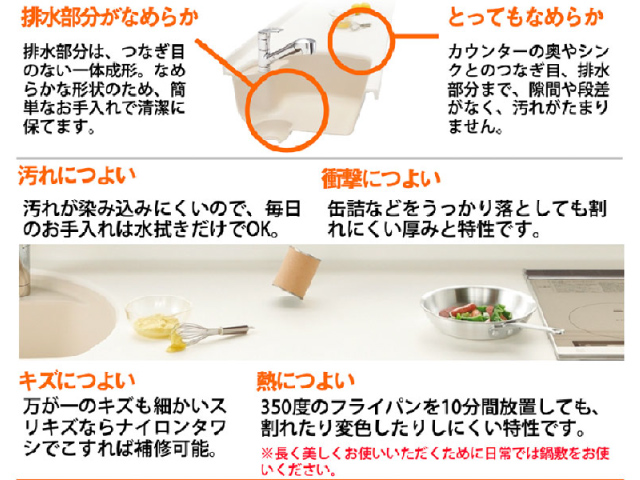 美しく心地よい、トクラスのキッチンカウンター。傷や汚れに強くてお手入れも簡単。痛みにくく長く使える安心のキッチンです。