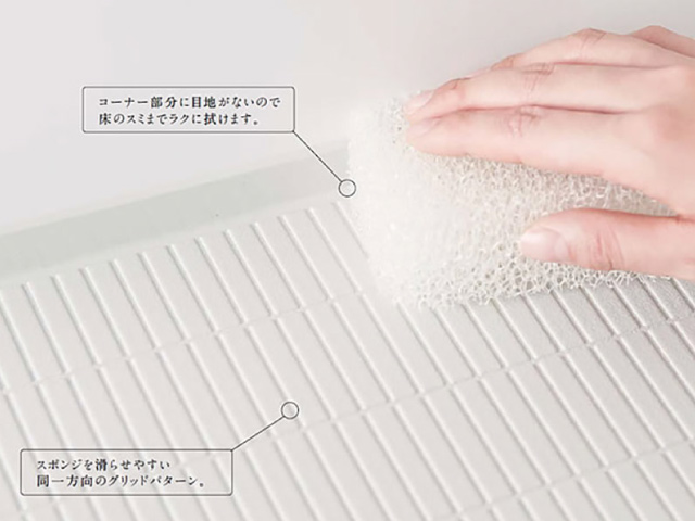 しっかりお掃除しても、目地にカビが生えがちな浴室のスミ。スミピカフロアは、床の端が立体的な構造のため、防水性に優れています。