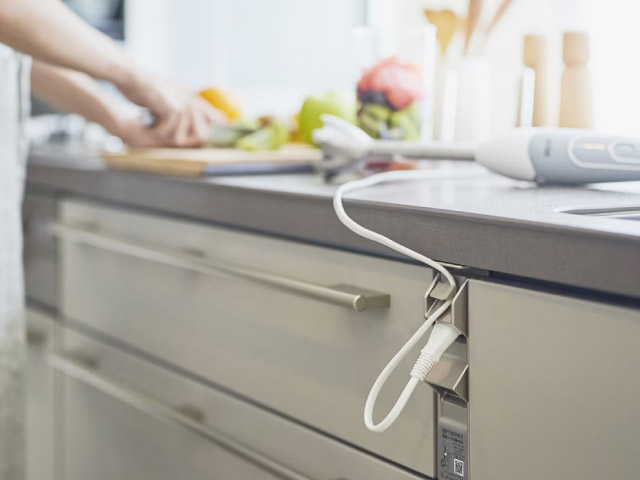 調理家電を取り出して、そのまますぐに使えます。ワークトップの手前から電源がとれるので、コードの位置を気にせずに、ハンディタイプの調理家電が使えます。また、カバーや扉にコードが挟まれるのを防止するフック付きで、2口コンセントは合わせて1500Wまで使えます。