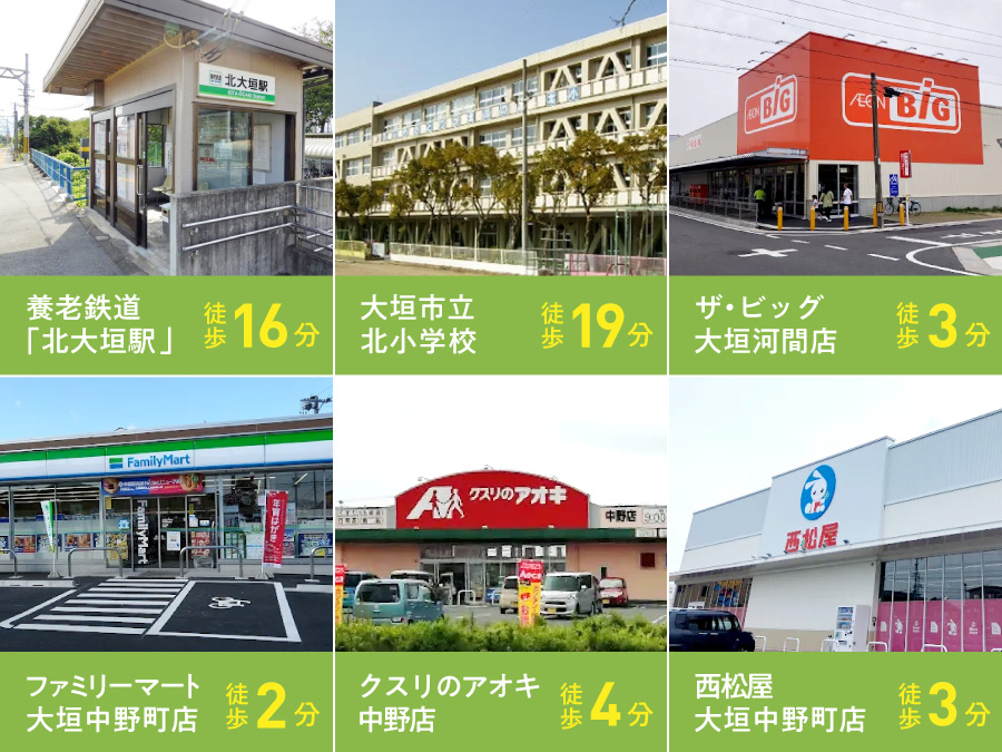 【小学校】 大垣市立小野小学校/徒歩6分 約450m 【中学校】 大垣市立東中学校/徒歩23分 約1,800m 【最寄り駅】 樽見鉄道「東大垣」/徒歩12分、約950m |