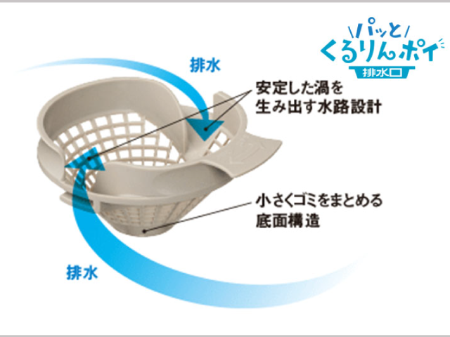 スムーズな水の流れを生み出すナイアガラフロー方式を採用し、シンク奥には汚れた水をしっかりキャッチする幅広の段差を設けました。さらに、どこからでも段差に向かってスピーディに水が流れるよう、底面の形状にもこだわっています。
