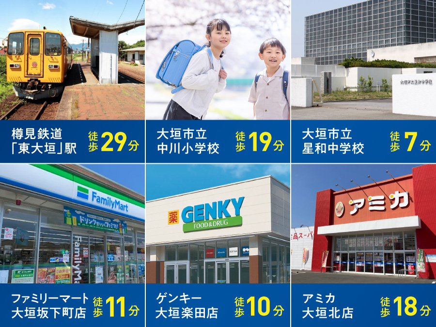 【小学校】 大垣市立小野小学校/徒歩6分 約450m 【中学校】 大垣市立東中学校/徒歩23分 約1,800m 【最寄り駅】 樽見鉄道「東大垣」/徒歩12分、約950m |