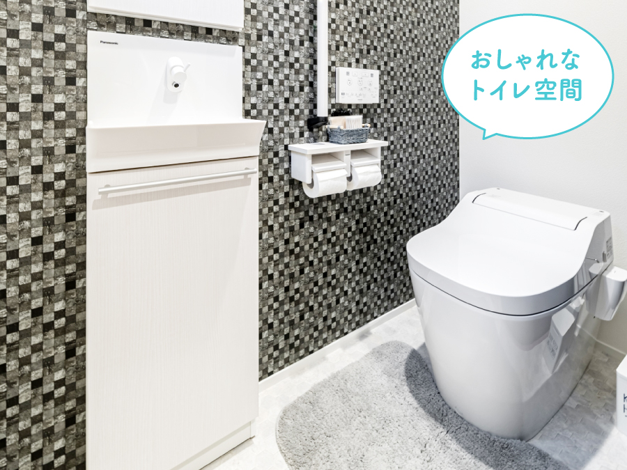 モザイクのアクセントクロスが洗練された清潔感のあるトイレ空間を演出。便利なコンパクト手洗いも採用しました。