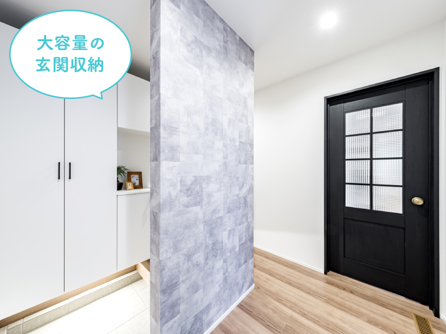 玄関ホールは間仕切り壁で家族用と来客用に分けることによって、生活感を感じづらい仕様に。大容量の収納ですっきり片付きキレイが続く玄関です。