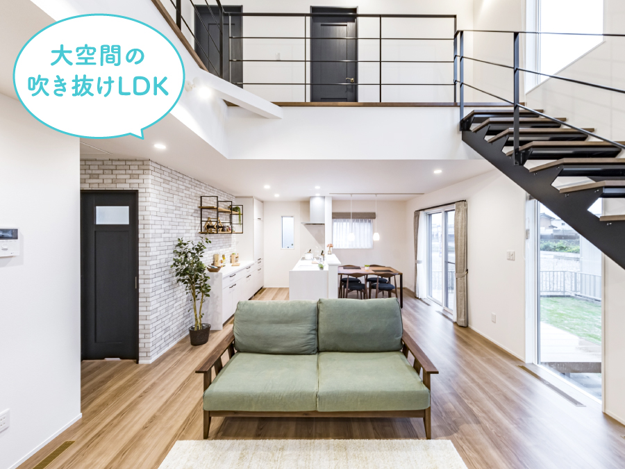 開放感あふれる吹き抜けリビングは、家族の笑顔が自然と集まる心地よい空間。