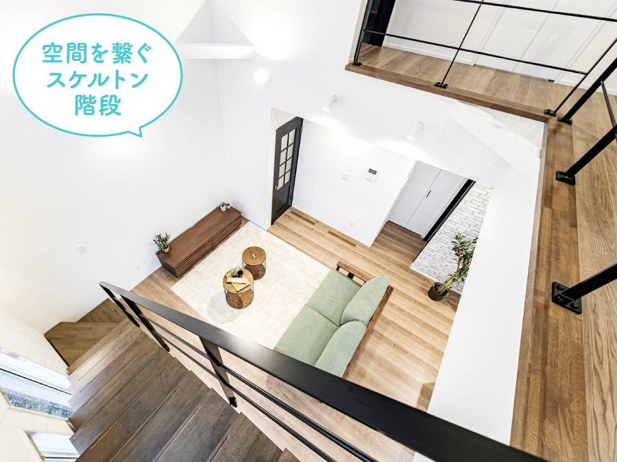 アイアン手すりのスケルトン階段は、圧迫感を与えず、空間全体を軽やかな印象に。上下階をゆるやかにつなぎ、家族の気配を感じられる設計です。
