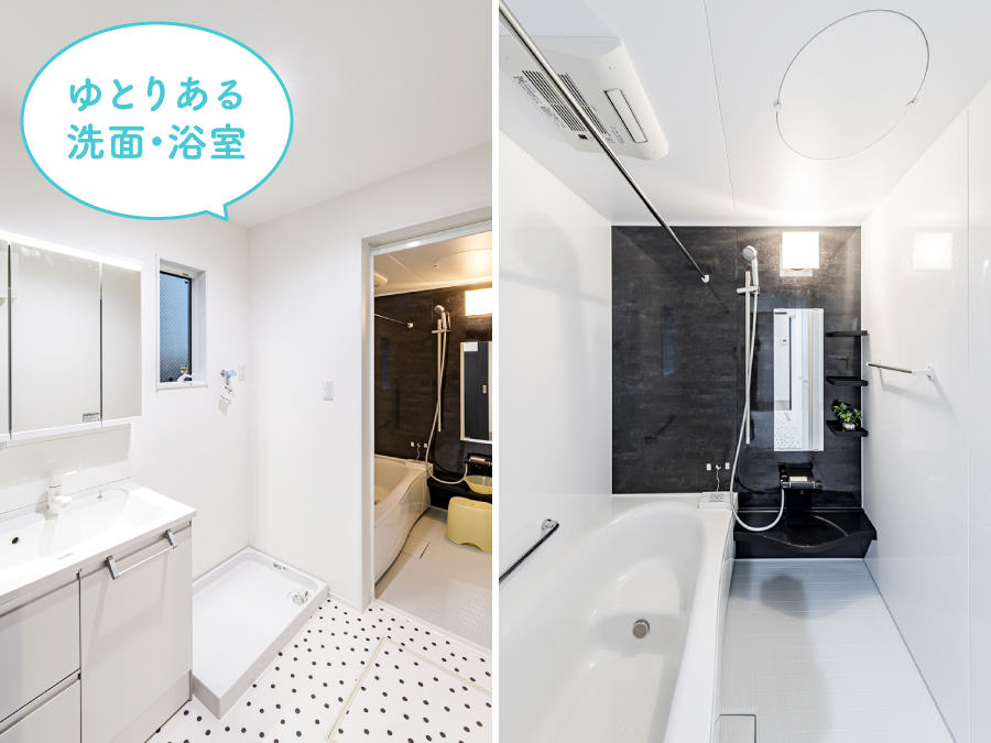 可愛らしいドット柄のクロスが目を引く洗面室は、朝の支度も楽しくなる空間。広々とした浴室と合わせて、一日のはじまりと終わりを心地よく過ごせるよう、機能性とデザイン性の両立にこだわりました。