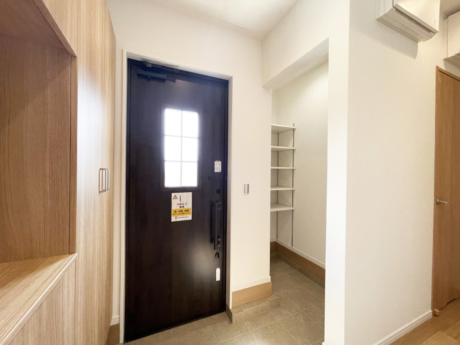 木の温もりが感じられる広い玄関に、たっぷり仕舞えるシューズクロークを採用。