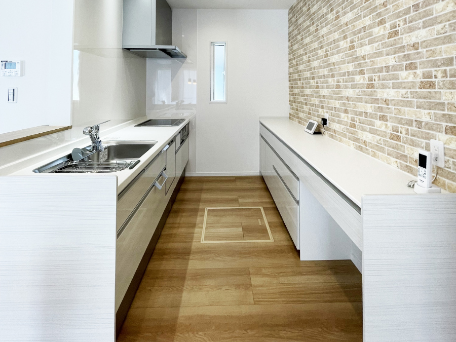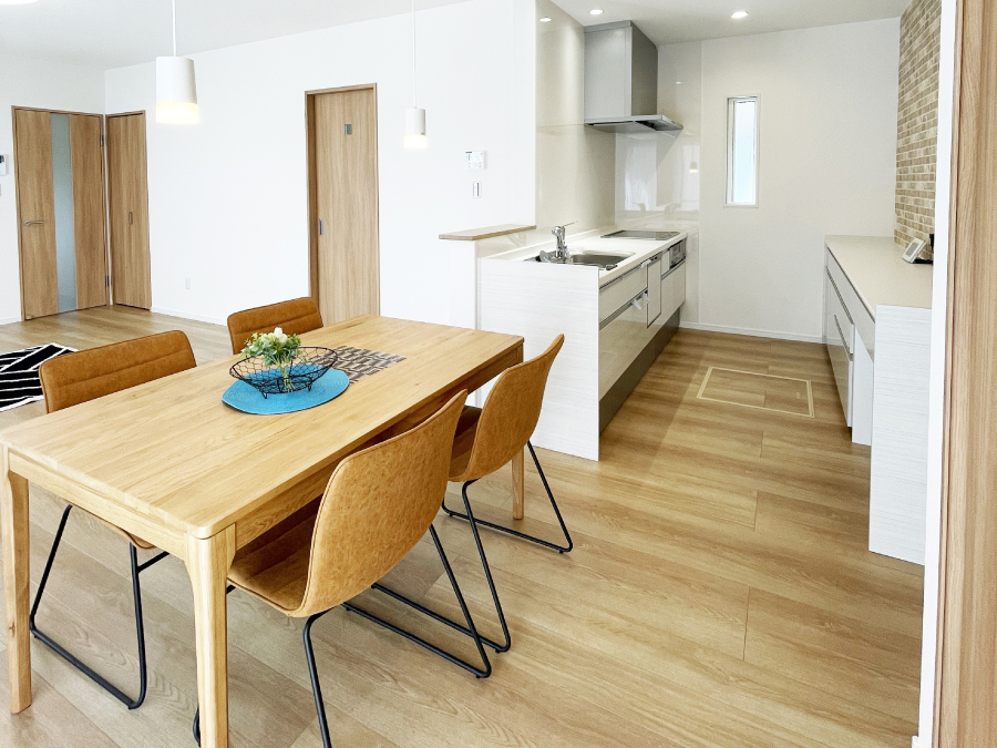 キッチンからリビング・ダイニングまで見渡せる開放的なレイアウト。家族のふれあいが自然に生まれる設計です。水回りを集めた動線で、家事もスムーズにこなせます。