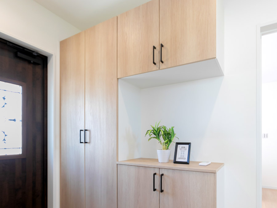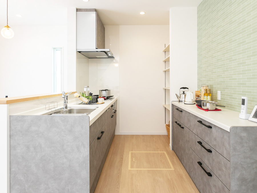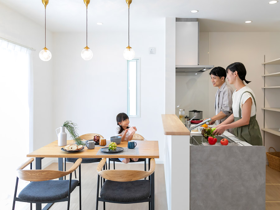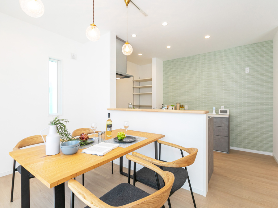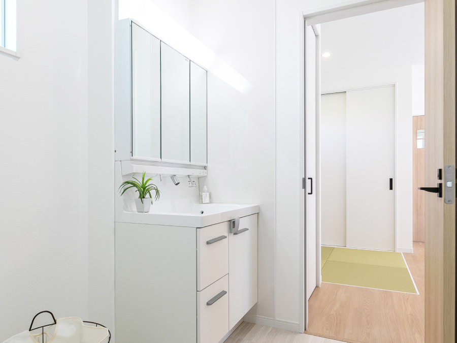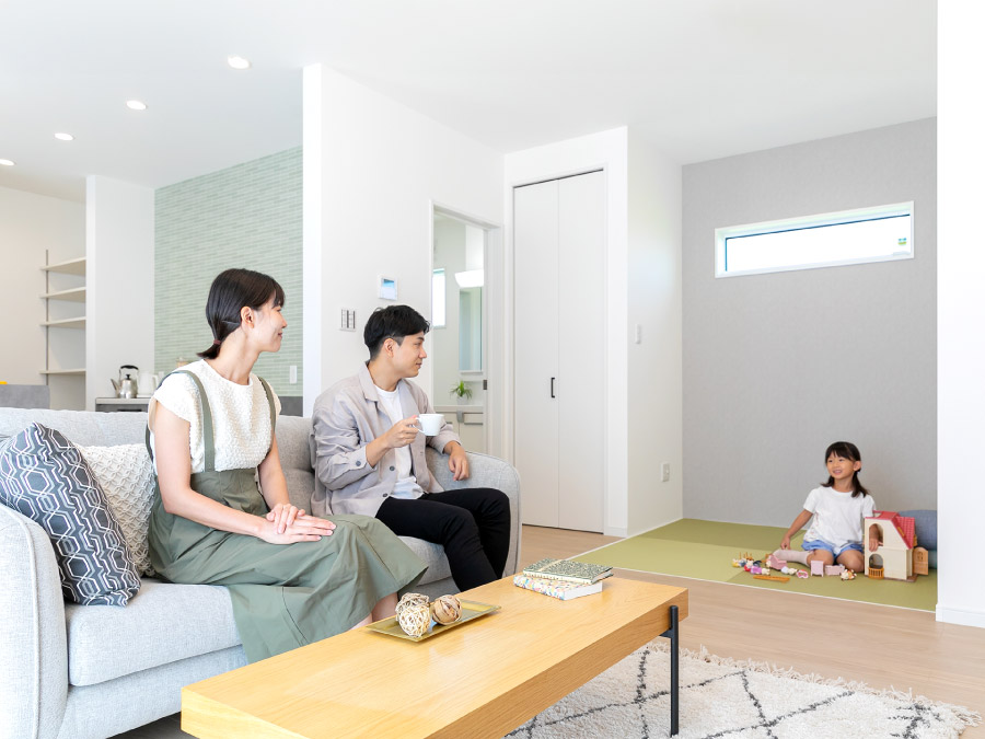 【性能×省エネ×デザイン性を兼ね備えた住まい】 高い耐震性能と太陽光発電を備えた、災害に強い安心安全の性能に加え 個性ある上品なデザインを兼ね備えた魅力的な住まいです。 【日当たりのよい家族が集うLDK】 明るい陽射しが差し込む開放的な18.5帖のLDK。 白を基調に木質フローリングの温もりが調和し、家族みんなが心地よく過ごせる空間です。 【爽やかなダイニングキッチン】 大きな窓から明るい陽が差すダイニングキッチンは、清潔感のある空間にスタイリッシュなグレーの対面キッチンが調和した、開放的かつ機能的な設計が魅力です。料理しながら家族との会話も弾みます。 【アクセントクロスが映えるキッチン】 爽やかなグリーンのアクセントクロスがワンランク上のおしゃれキッチンを演出。お家カフェのような空間で、日常に彩りをプラスします。 【安全・便利な畳コーナー】 リビングには段差のない畳コーナーを設置。お子様の遊び場として使用してもつまずいたりする心配がなく安心です。畳横には収納スペースを設け、日用品やおもちゃなどすっきりと片付けられます。 【機能的でスタイリッシュなシステムキッチン】 広々シンクやワークトップ、お掃除が簡単なIHクッキングヒーター、食器洗い乾燥機など、機能性に優れたシステムキッチンで、毎日の家事がもっとラクに、もっと楽しくなります。 【キッチンがすっきり片付く収納力】 キッチンと同色のカップボードには、調理家電や食器類をすっきり収納。 さらに、食品ストックや調味料の収納に便利なパントリーも備え、収納力は申し分ありません。 【水回りをまとめた家事ラク動線】 洗面・脱衣所がリビングとゆるやかにつながった設計で、キッチンからの動線もスムーズ。 毎日の家事がグンと楽になります。 【疲れを癒す浴室】 ゆったりと体を休めることのできるワイドな浴槽はお湯が冷めにくい保温構造で日々の疲れを癒します。 【大容量の玄関収納】 たっぷり収納できるシューズクロークに、お出かけ小物や季節ものも片付く棚をプラス。 いつでも玄関をきれいに保てる、うれしい設計です。 間取り 3LDK+畳コーナー+土間収納+パントリー 土地面積 170.04㎡(51.43坪) 建物面積 106.82㎡(32.31坪) 販売価格 3,170万円(税込) 仲介手数料無料、外構一式無料です。 この物件を見学する 間取りFLOOR PLAN 配置図 1F 2F 水回りと生活スペースがフラットに繋がる機能的な暮らしの動線が魅力的な住まい。 洗面・浴室がリビングから繋がる便利な動線。 南向きLDKは18.5帖!開放感溢れる癒しの空間です。 オープンな収納を併設した主寝室はゆとりある10帖の広さ。 VRで暮らしを体感 この物件を見学する その他の区画 号地 6号地 7号地 販売価格 2,990万円(税込) 3,090万円(税込) 土地面積 170.02㎡(51.43坪) 170.02㎡(51.43坪) 建物面積 110.95㎡(33.56坪) 110.95㎡(33.56坪) 間取り 3LDK+納戸+パントリー+土間収納+ファミリークローゼット 3LDK+WIC+パントリー+畳コーナー 畳スペース × 〇 土間収納 〇 × 詳細・お問合せ 詳しく見る 詳しく見る この物件を見学する 分譲住宅へ戻る