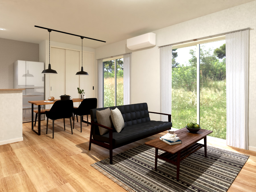 広さ20帖のLDKは、家族がゆったりと過ごせる開放的な空間。南向きの2つの大きな窓から差し込む陽光で、家全体が明るく快適です。