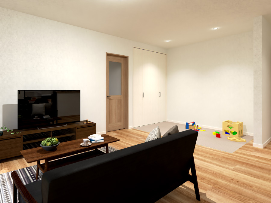 広いリビングには、子どもたちが安全にのびのび遊べる畳のスペースを確保しました。