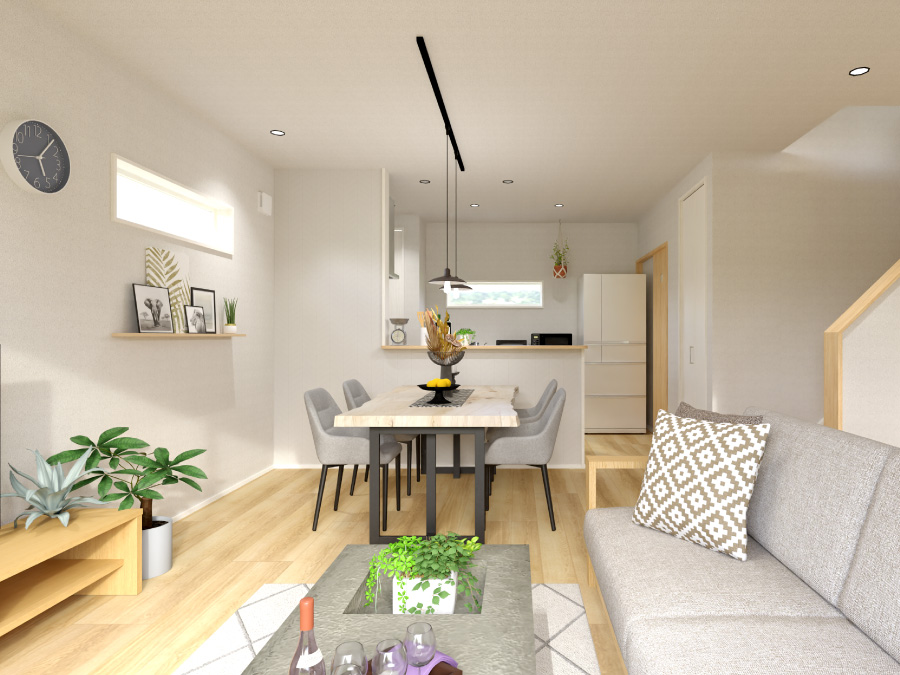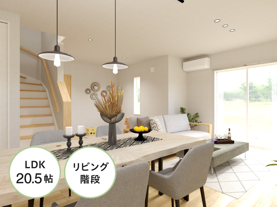 洗練された内装デザインが心地よさをプラスする20.5帖の広いLDKは、リビング階段を採用し家族と自然にコミュニケーションが取れる間取りに。大空間ながらつながりを感じられる心地よいLDKを実現しました。