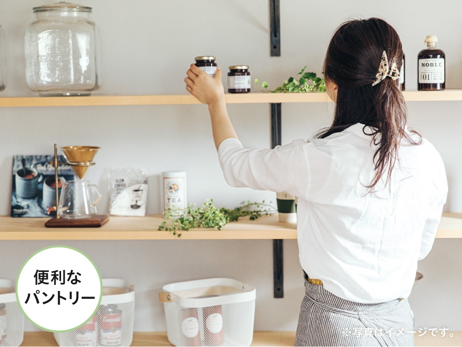 キッチンには食品ストックやキッチン用品などを収納できる便利なパントリーを採用。