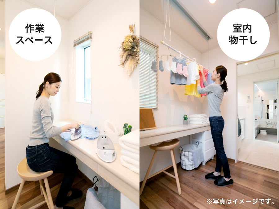 4.5帖のゆとりある洗面・脱衣所には、ハンガーパイプや作業カウンターを備えました。