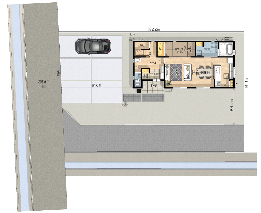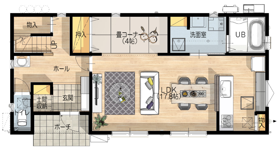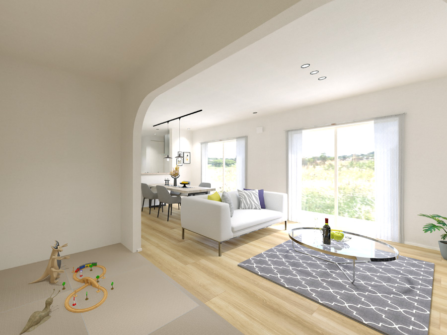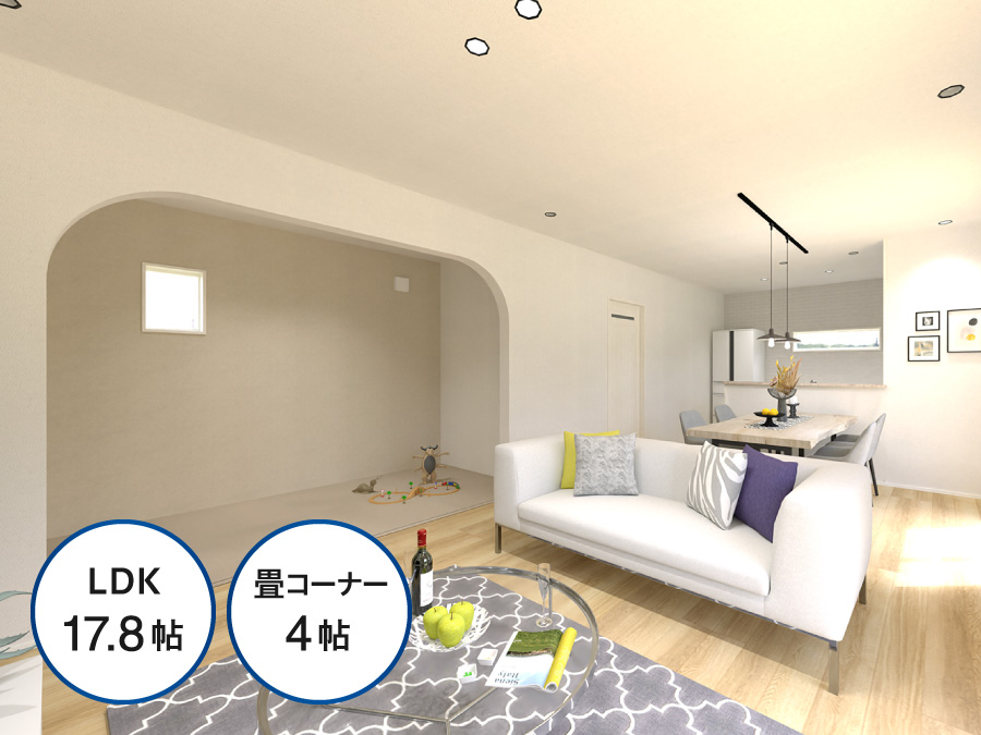 17.8帖の広々としたLDKには、Rの垂れ壁がおしゃれなリビングと繋がる4帖の畳コーナーを採用。