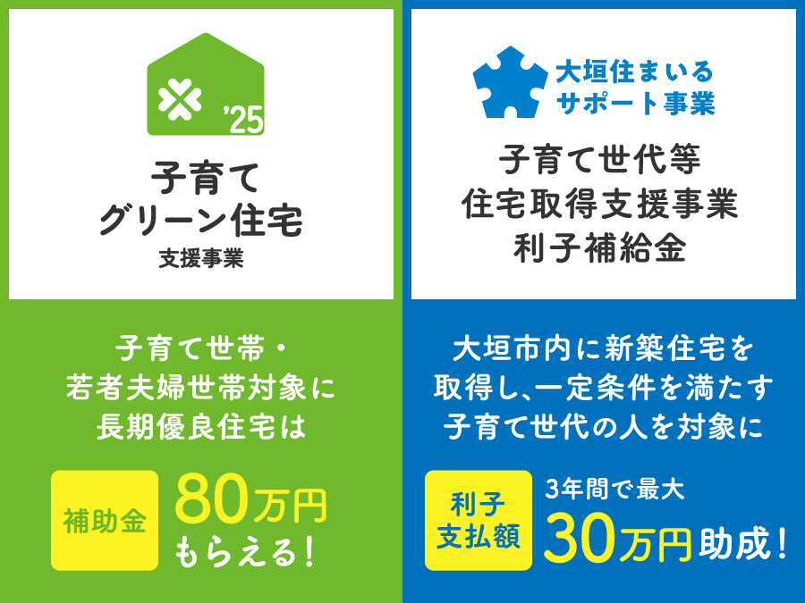 「子育て世代等住宅取得支援事業利子補給金」大垣市内に新築住宅を取得し、一定条件を満たす子育て世代の人を対象に、利子支払額を3年間で最大30万円助成されます。