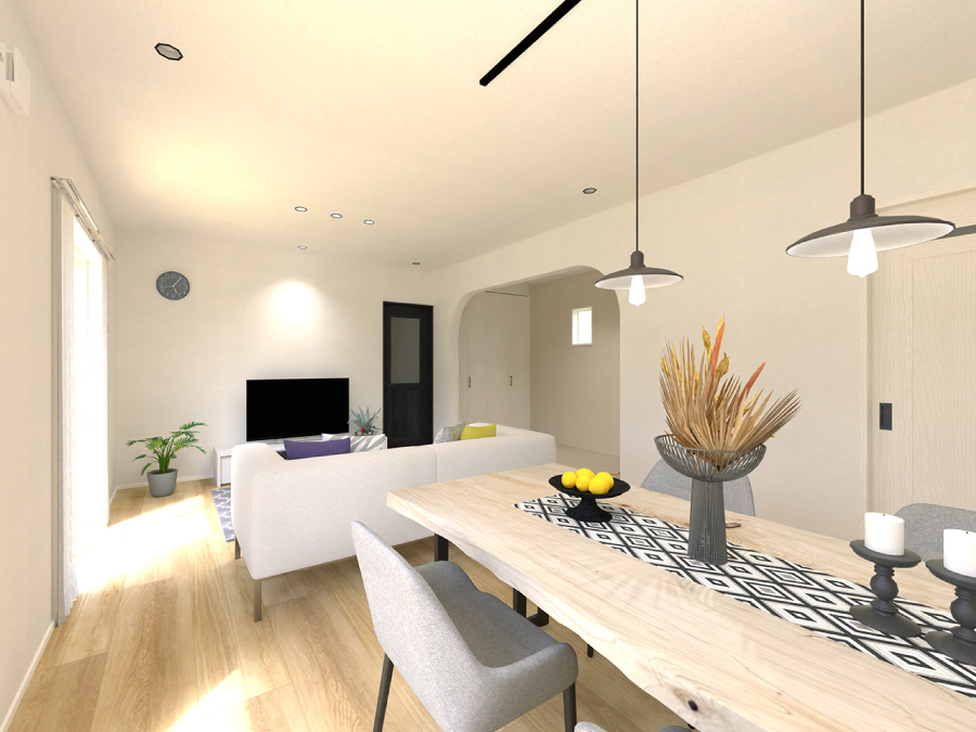 ワイドな窓からは、やわらかな陽の光がたっぷりと差し込み、リビング全体を明るく包み込みます。時間とともに移ろう自然光が心地よく、家族が集う空間にぬくもりと開放感をプラスします。
