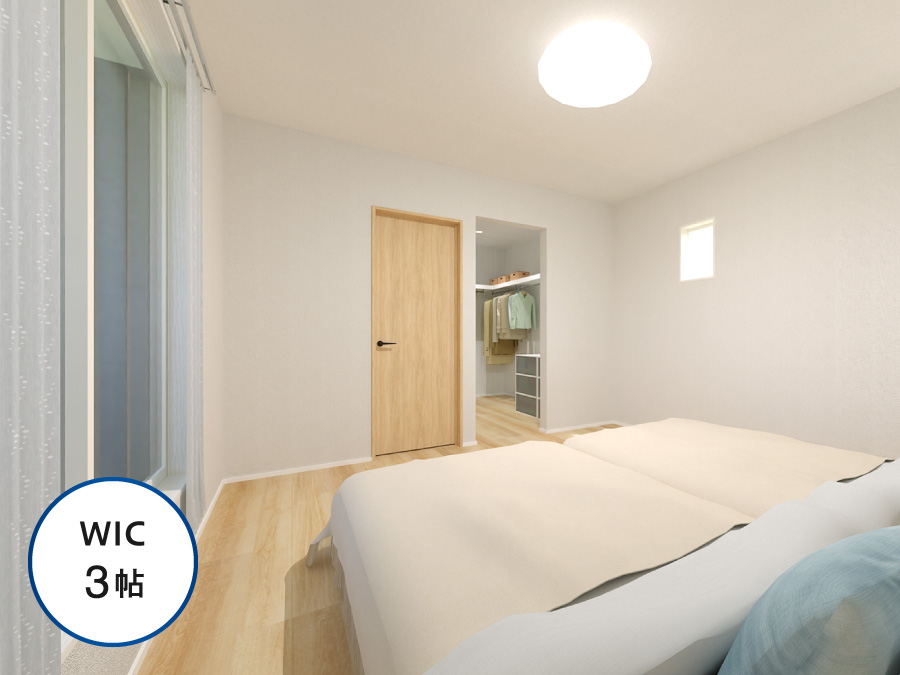 主寝室には3帖のWICを採用。衣類や季節物はもちろん、大きなキャリーケースや寝具なども収納できます。十分な収納力で、常に整った空間を維持できます。