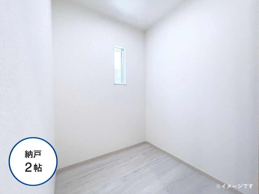 収納力抜群の2帖の納戸は、普段使わない家電や趣味の道具、日用品のストックなど、さまざまなものを整理できる頼もしい空間。生活にゆとりを生む小さな書斎や作業スペースとしての活用も可能です。