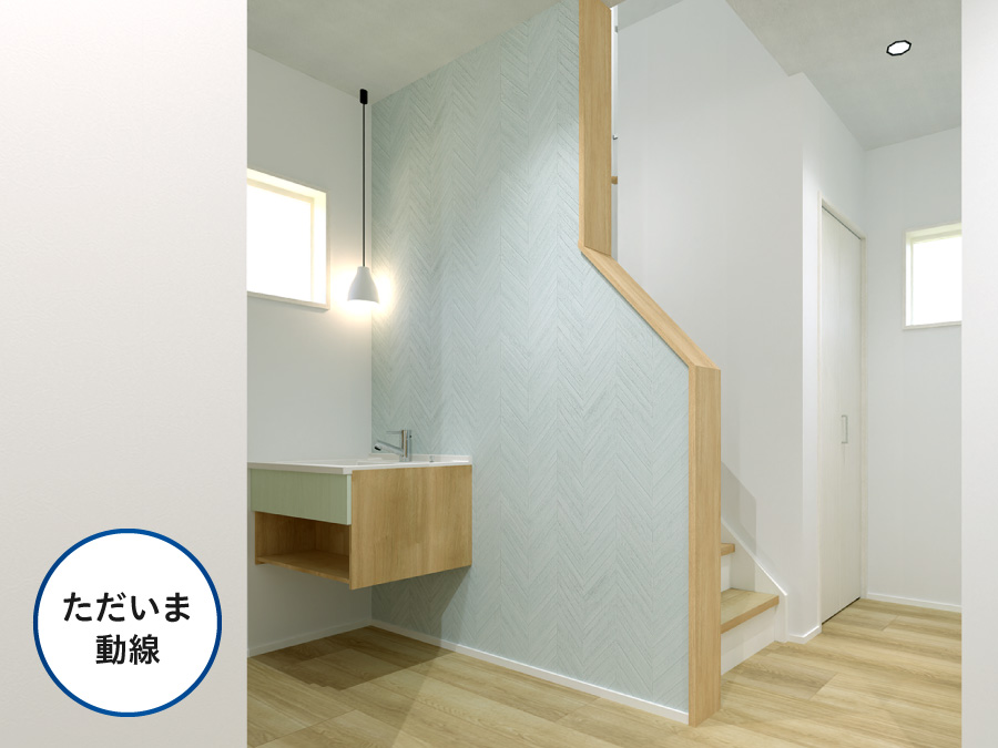 玄関ホールに手洗い用の洗面台を設けることで、帰宅後すぐに手や顔を清潔にでき、家の中をいつも清潔に保てます。家族や来客にとっても安心の衛生環境です。