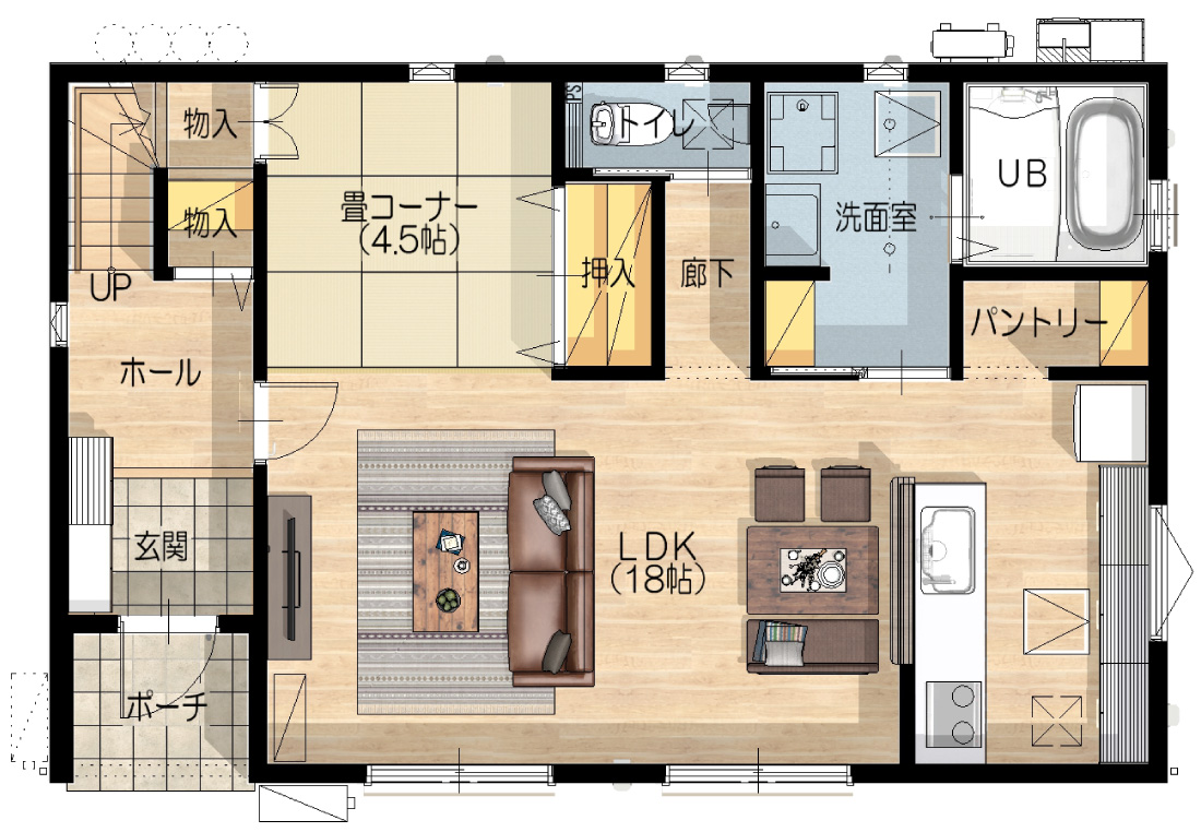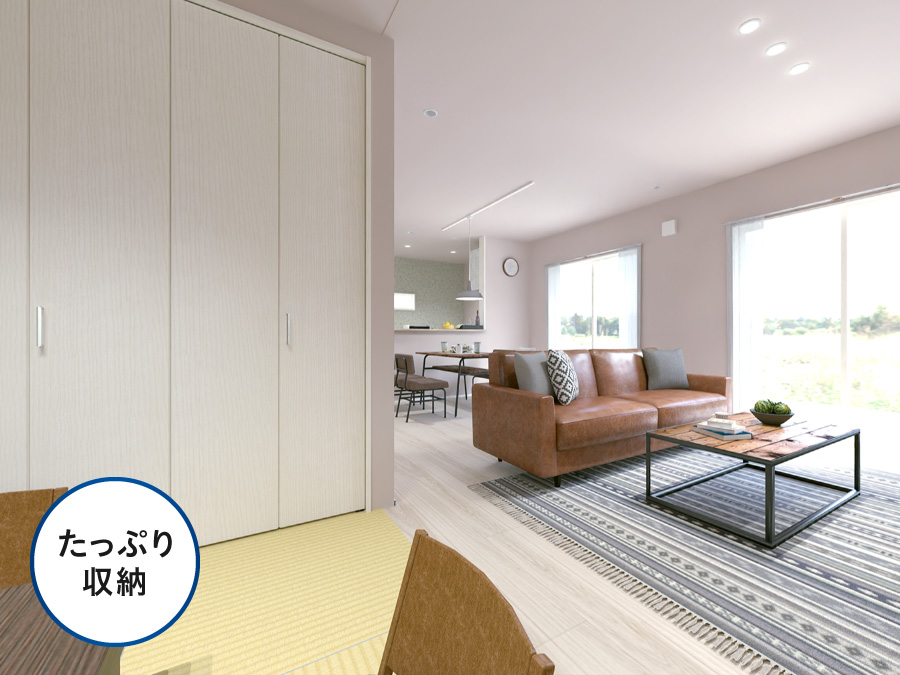 18.5帖のゆとりあるLDKには、4.5帖の畳コーナーを採用。大容量のリビング収納には、掃除道具やお子様のおもちゃ、来客用の寝具など様々なアイテムを収納できます。デザイン性と使いやすさを両立したキッチンにはパントリーも備え、収納面も充実。家族が心地よく過ごせる空間です。