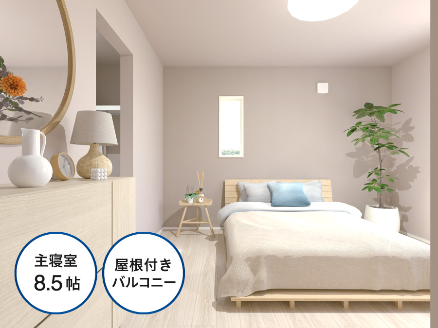 8帖の主寝室は、ダブルベッドを置いてもゆとりある広さ。主寝室から繋がる屋根付きのバルコニーでは、天気を気にせず洗濯物を干すことができて便利です。
