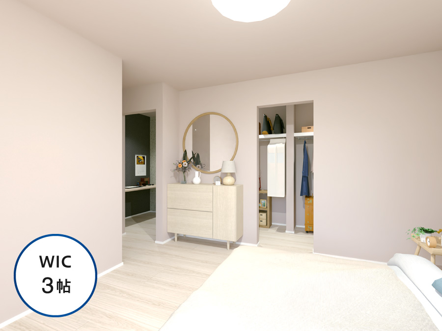 主寝室には3帖のWICを採用。衣類や季節物はもちろん、大きなキャリーケースや寝具なども収納できます。十分な収納力で、常に整った空間を維持できます。