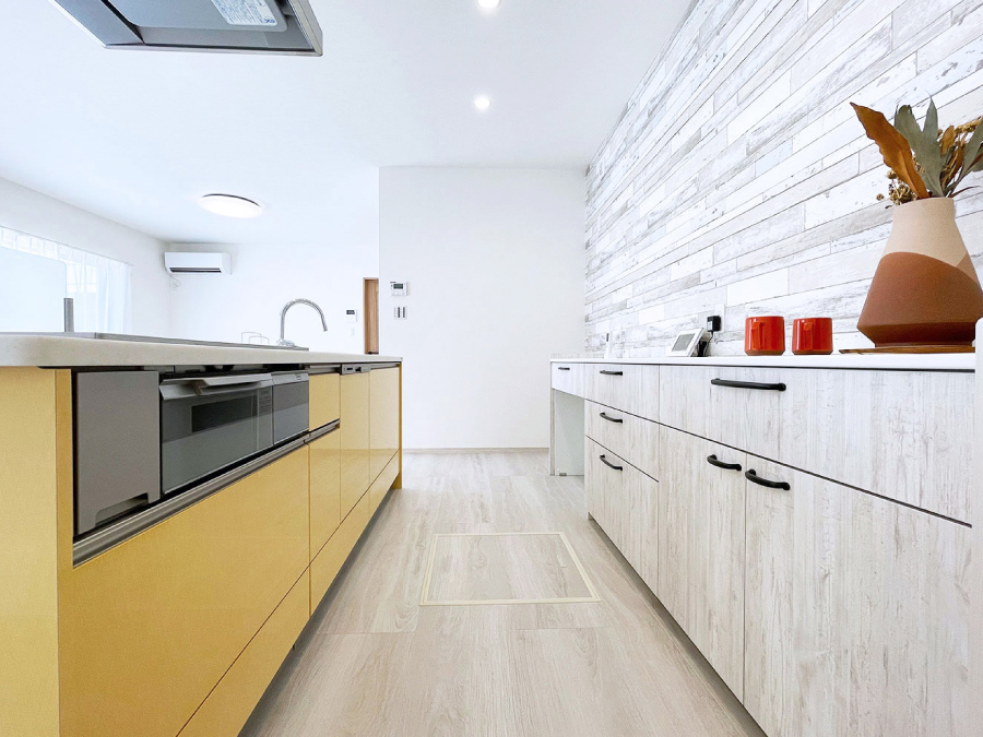 アイランドタイプのキッチンはリビング側にも収納があるので、小物やキッチングッズの整理などにも利用できます。