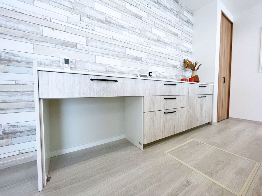 キッチン背面には便利なカップボードをセットしました。キッチンとの動線も良く、調理中の出し入れもスムーズ!