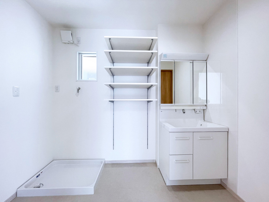 清潔感があり、小窓付きで湿気対策もバッチリの洗面脱衣所。収納も充実しています。