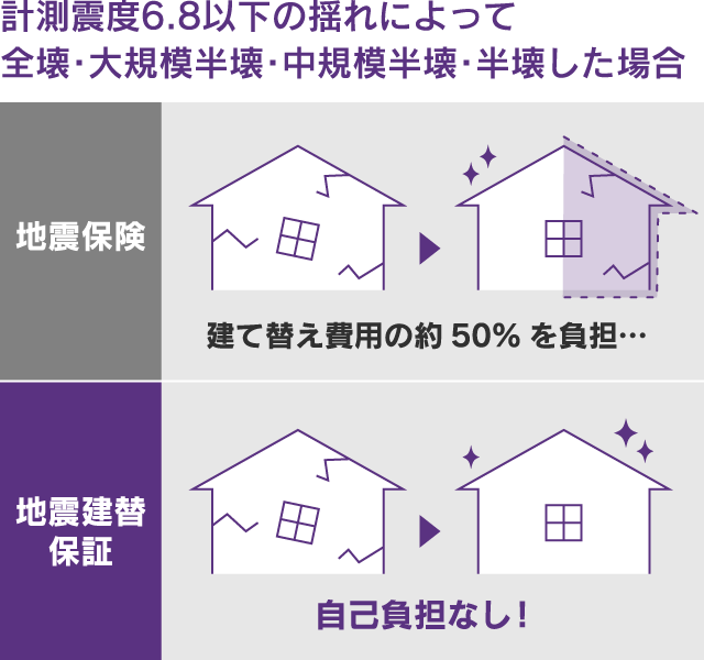 万が一、地震により住宅が倒壊してしまった場合、地震保険に加入していても、保険が下りるのは建て替え費用の50%までですが、岡本住建の「地震建替保証」は、建て替え費用を建物販売価格まで保証いたします。建て替え時の自己負担が発生しないため、地震発生時の住居修復に関する費用を心配する必要はありません。